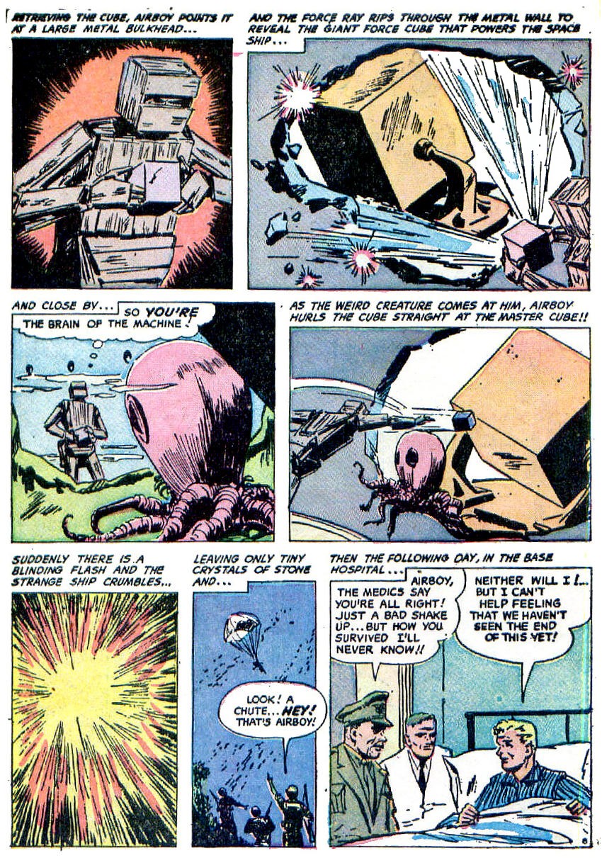 Airboy doesn't need to call in the Army (there wouldn't be room in eight pages, anyway) to handle an invasion from space. He's got his wits, savvy, and a suit of wooden armor.